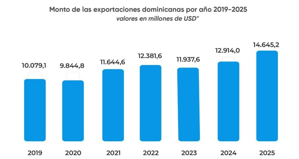 Santo Domingo, República Dominicana. – La República Dominicana alcanzó en 2025 un récord histórico en exportaciones, al totalizar US$14,645.2 millones, lo que representa un crecimiento interanual de 13.4% y un incremento absoluto de US$1,731.2 millones respecto a 2024, informó el Centro de Exportación e Inversión de la República Dominicana (ProDominicana).
