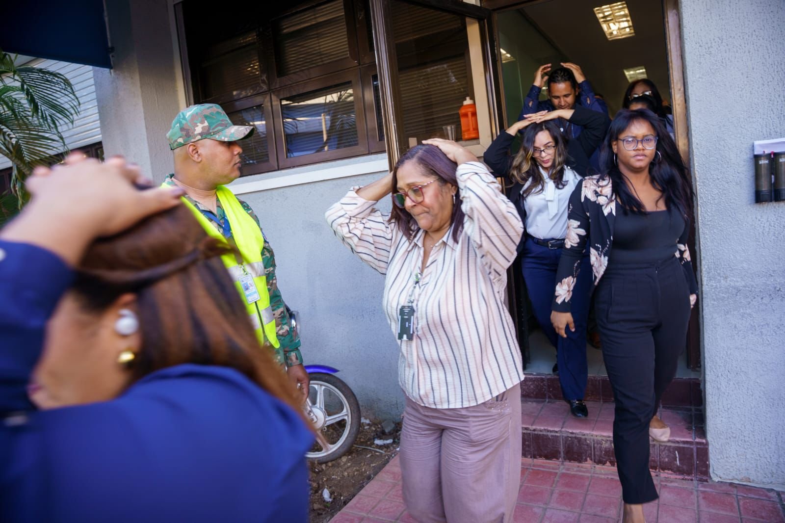 El entrenamiento inició a las 9:00 a.m., cuando se hicieron sonar las alarmas y los brigadistas civiles y militares activaron los protocolos de evacuación y orientaron y guiaron al personal hacia las rutas y puntos de encuentro establecidos.