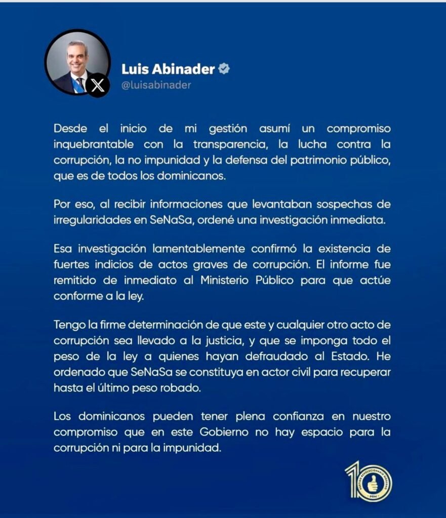 Santo Domingo.– El presidente Luis Abinader afirmó este domingo que la investigación realizada en el Seguro Nacional de Salud (SeNaSa) es una muestra clara de la determinación de su administración de actuar sin dilaciones ante cualquier señal de irregularidad y de garantizar que en su Gobierno no habrá casos de corrupción que no sean investigados a fondo.